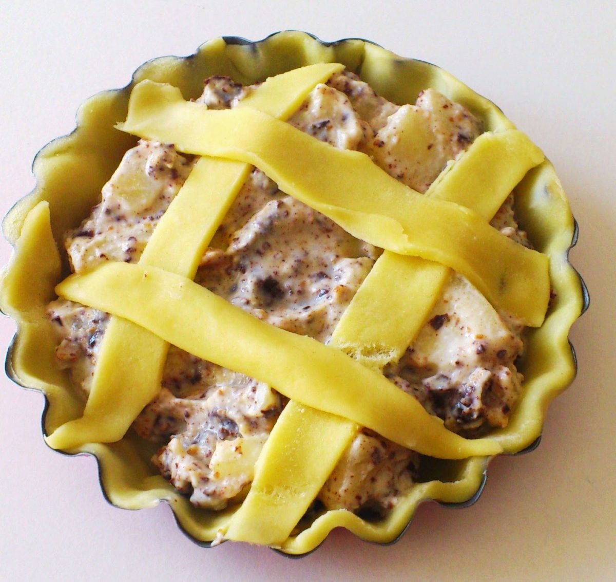 togli le tartellette dal forno ed aggiungi il composto quindi decora con i ritagli della frolla.