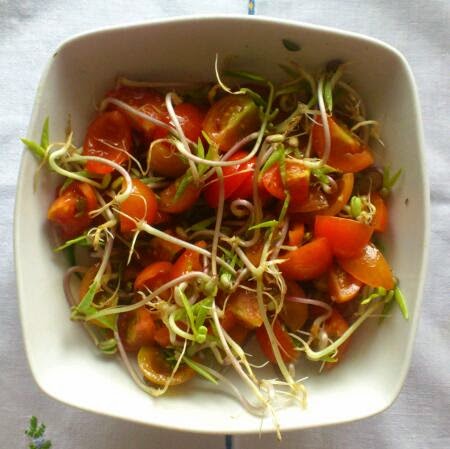 – CROSTINI DI PANE TOSCANO E POMODORINI con germogli freschi di fagiolo mungo conditi origano secco, origano fresco ed olio evo.