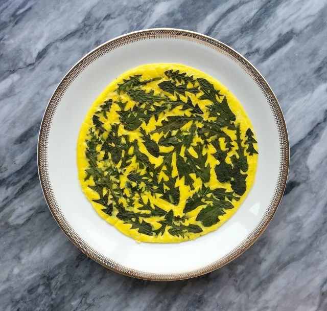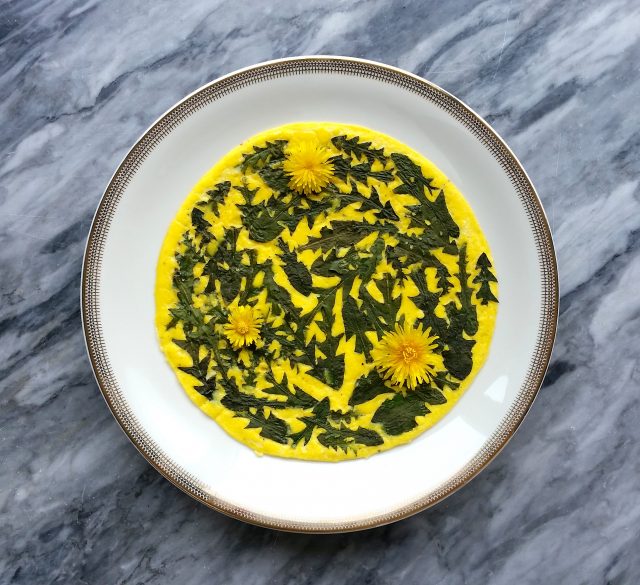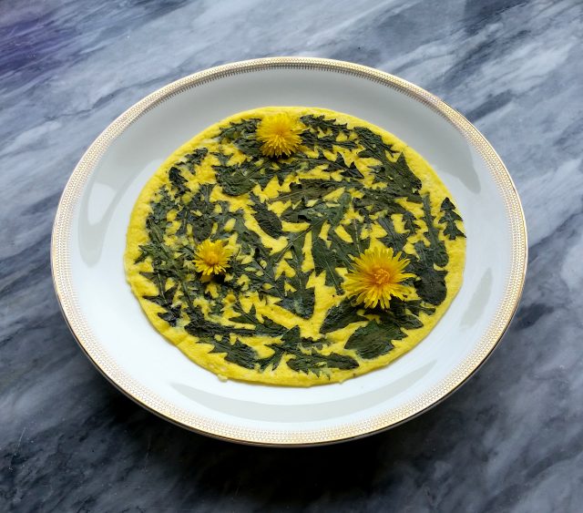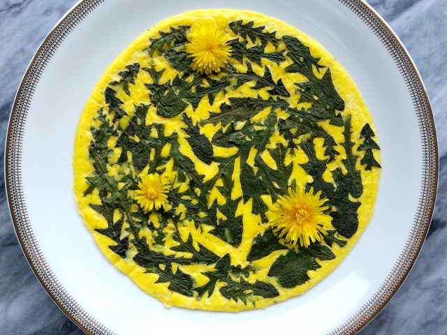 mi è venuta subito in mente una frittata con foglie crude e petali di tarassaco.