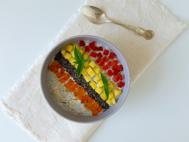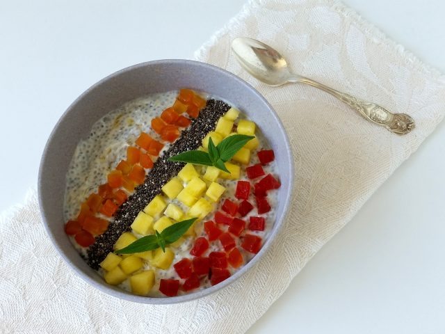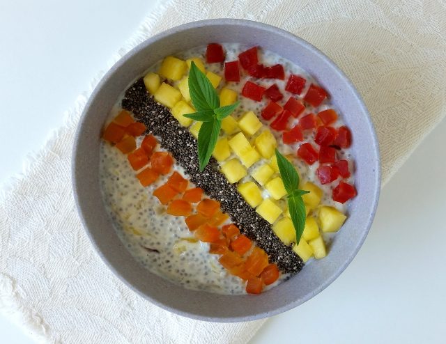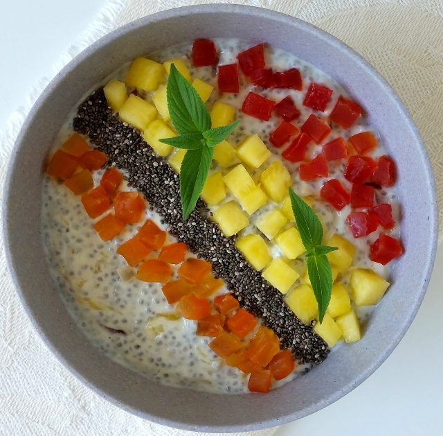The “bowl breakfast” can be made with yoghurt, fresh, dry, dehydrated fruit, muesli, chia seeds, oats, jams, porridge, quinoa, smoothie, spices …