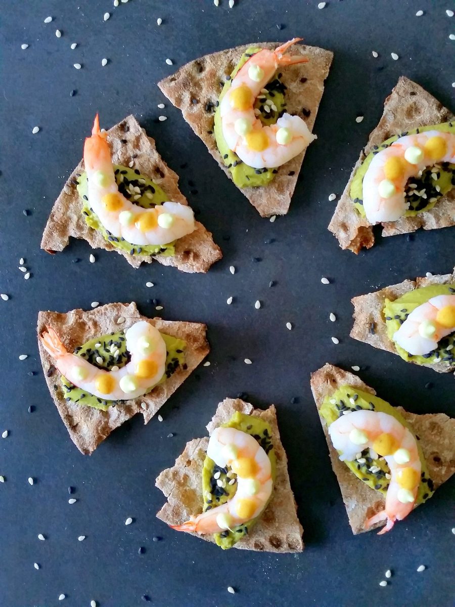 Componi i crostini spalmando la base con l’hummus poi aggiungi il gambero e decora con la maionese vegana, la salsa speziata ed i semi di sesamo nero e bianco.