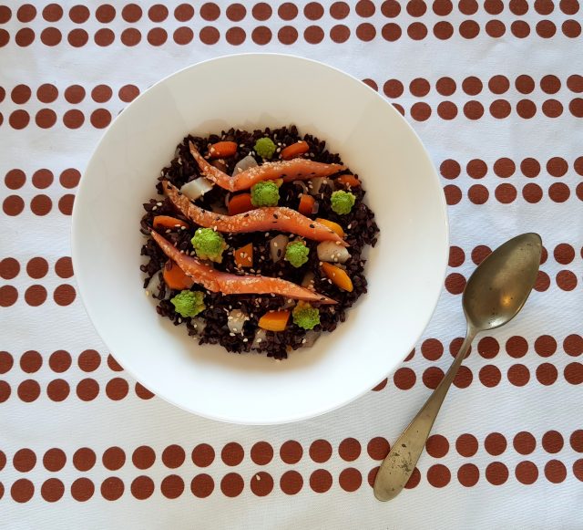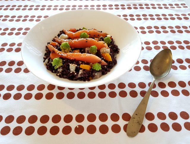 il Riso Venere con verdure croccanti, salmone e semi di sesamo