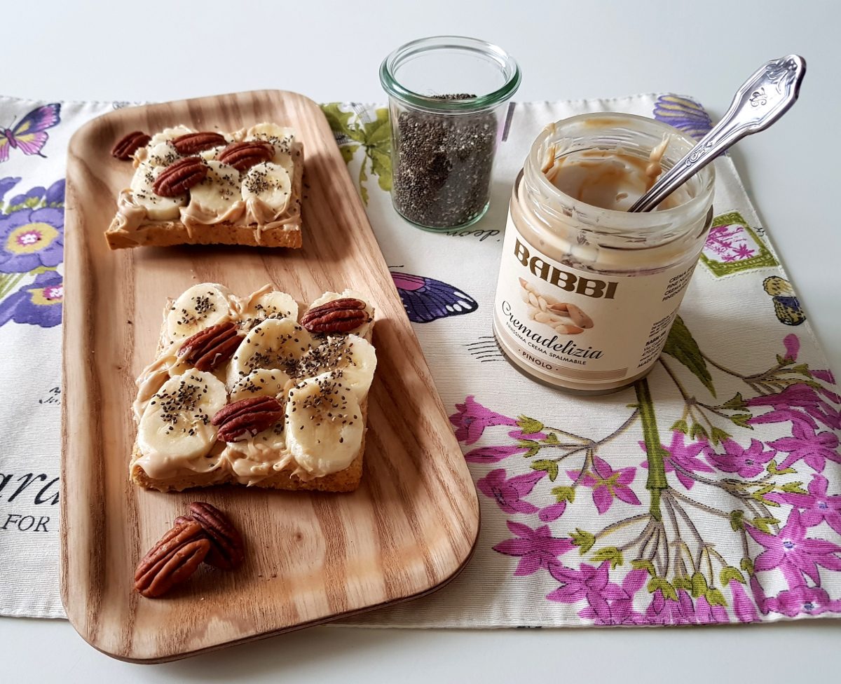 Fette integrali con cremadelizia pinoli banana semi di chia e noci pecan