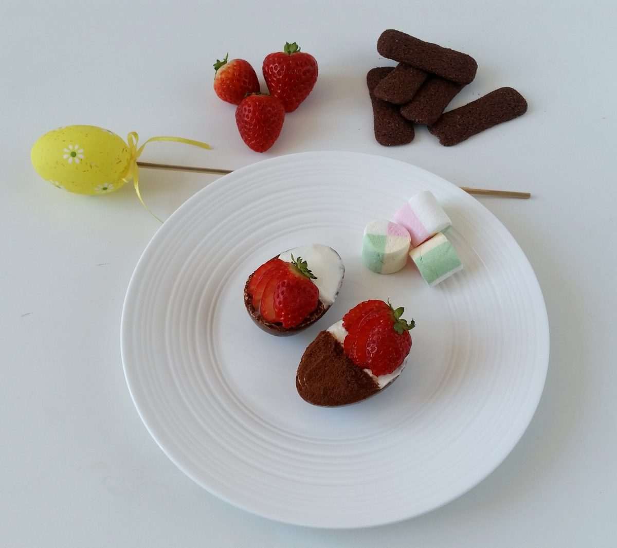 la ricetta è davvero molto semplice e si prepara in poco tempo, si farciscono delle mezze uova di cioccolato con biscotti e tiramisù light alla ricotta.