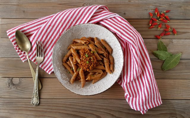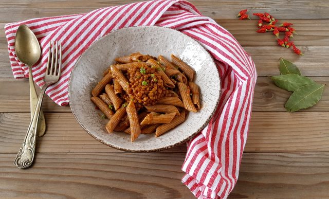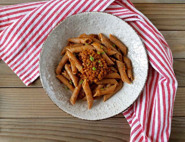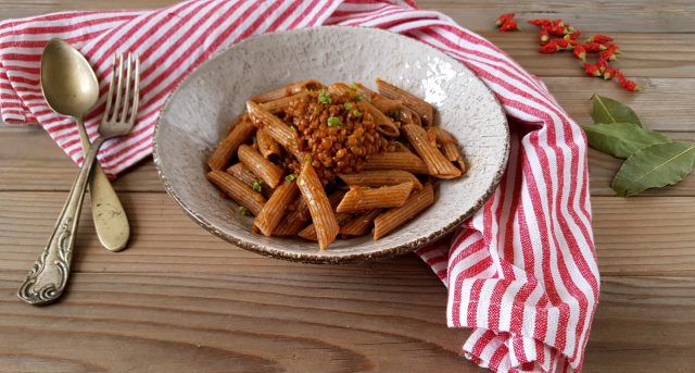 Penne di farro dicocco integrale con ragù di lenticchie e alghe