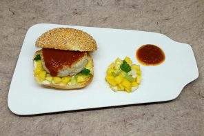 Fish burger con tartare di mango e cipollotto e ketchup fatto in casa