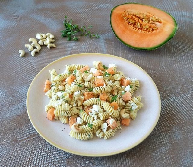 Pasta estiva con melone feta anacardi e semi di papavero