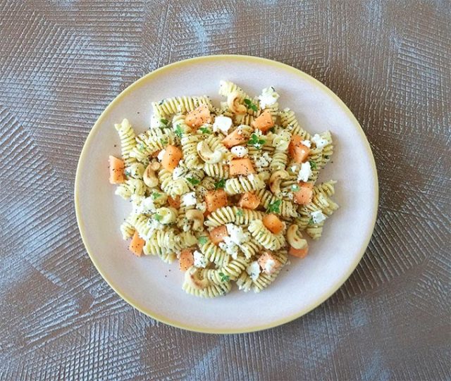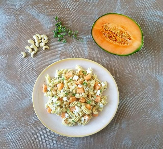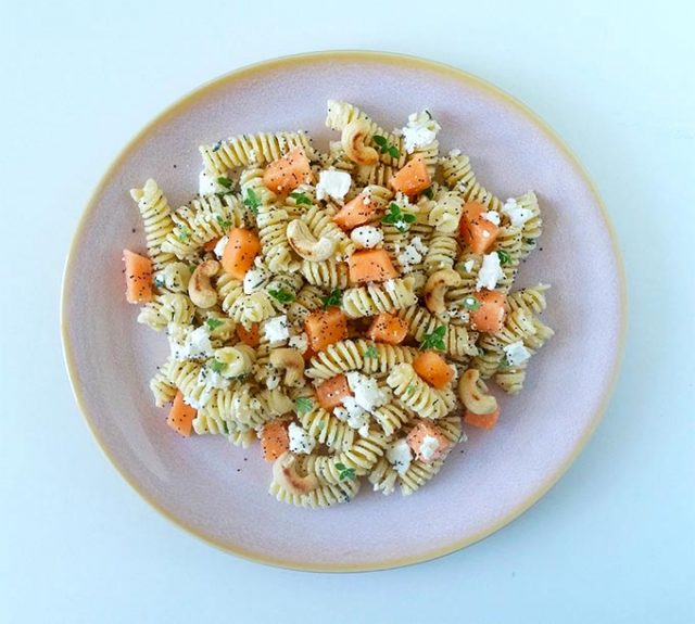 la mia pasta estiva con melone feta anacardi e semi di papavero è la soluzione ideale se non volete rinunciare ad un pasto gustoso e ricco.