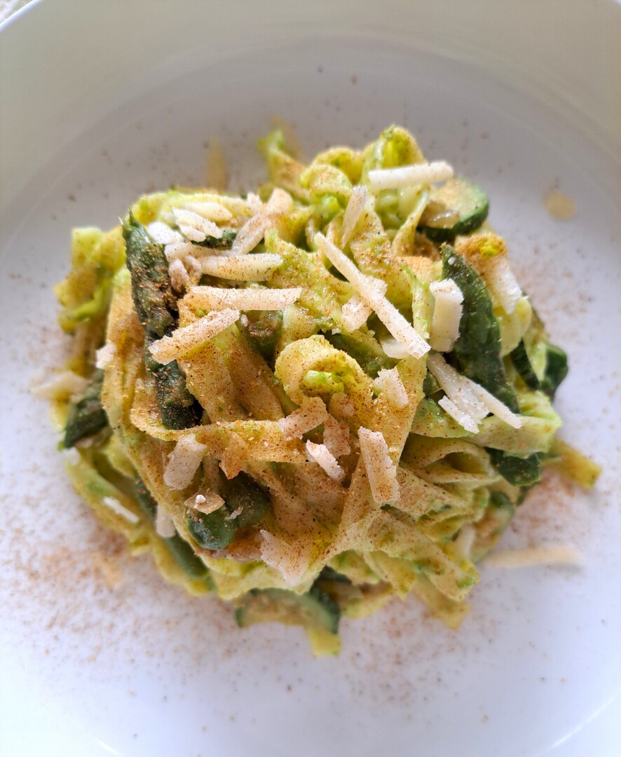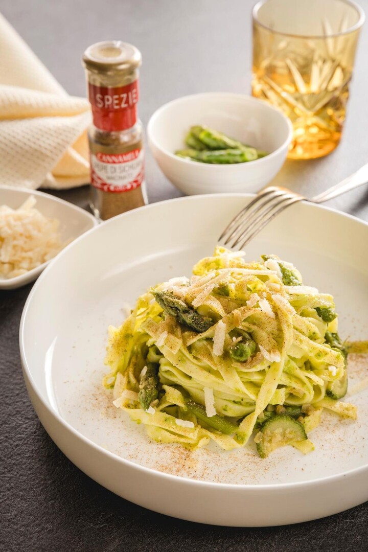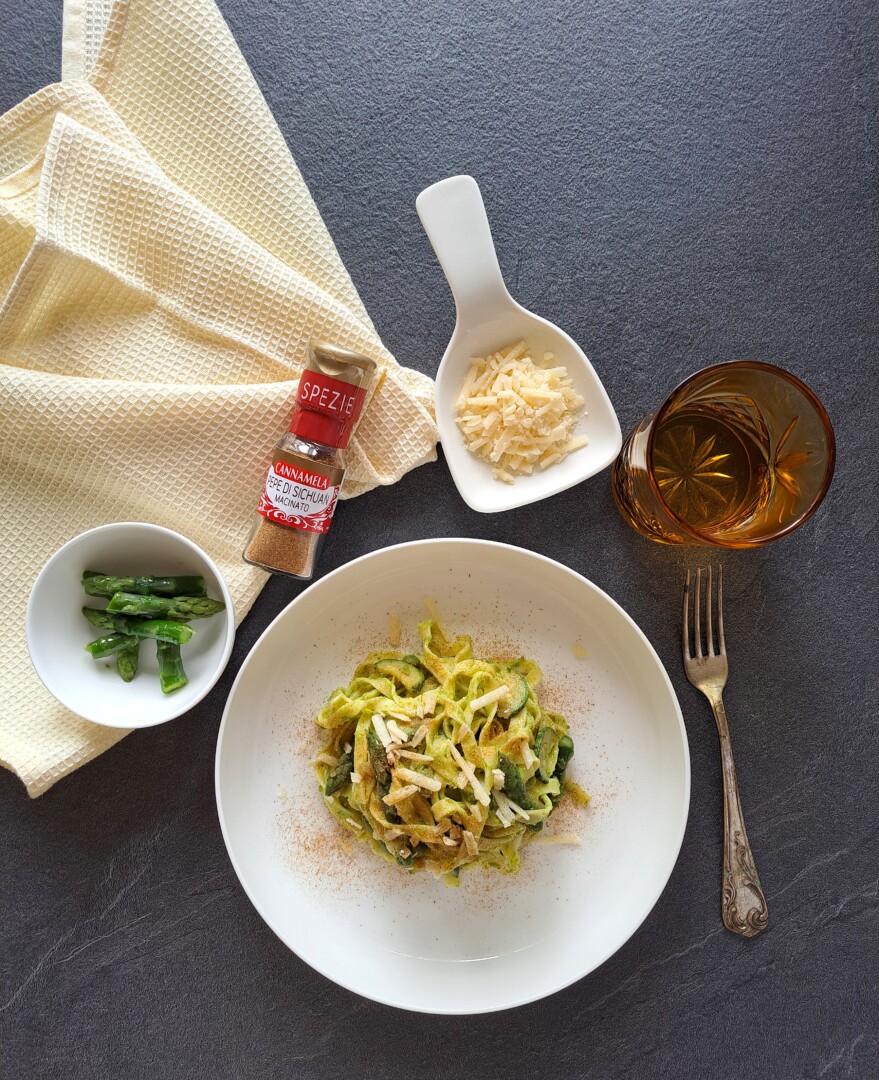 Linguine verdi con asparagi zucchine e pepe di Sichuan
