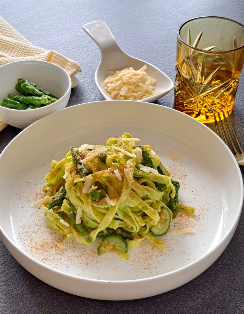 Linguine verdi con asparagi zucchine e pepe di Sichuan