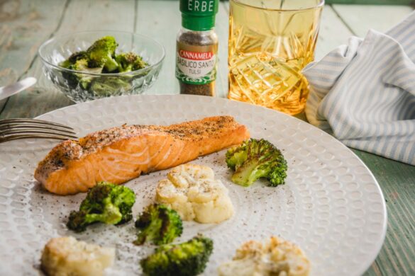 Salmone con broccoli, cavolfiore e basilico santo